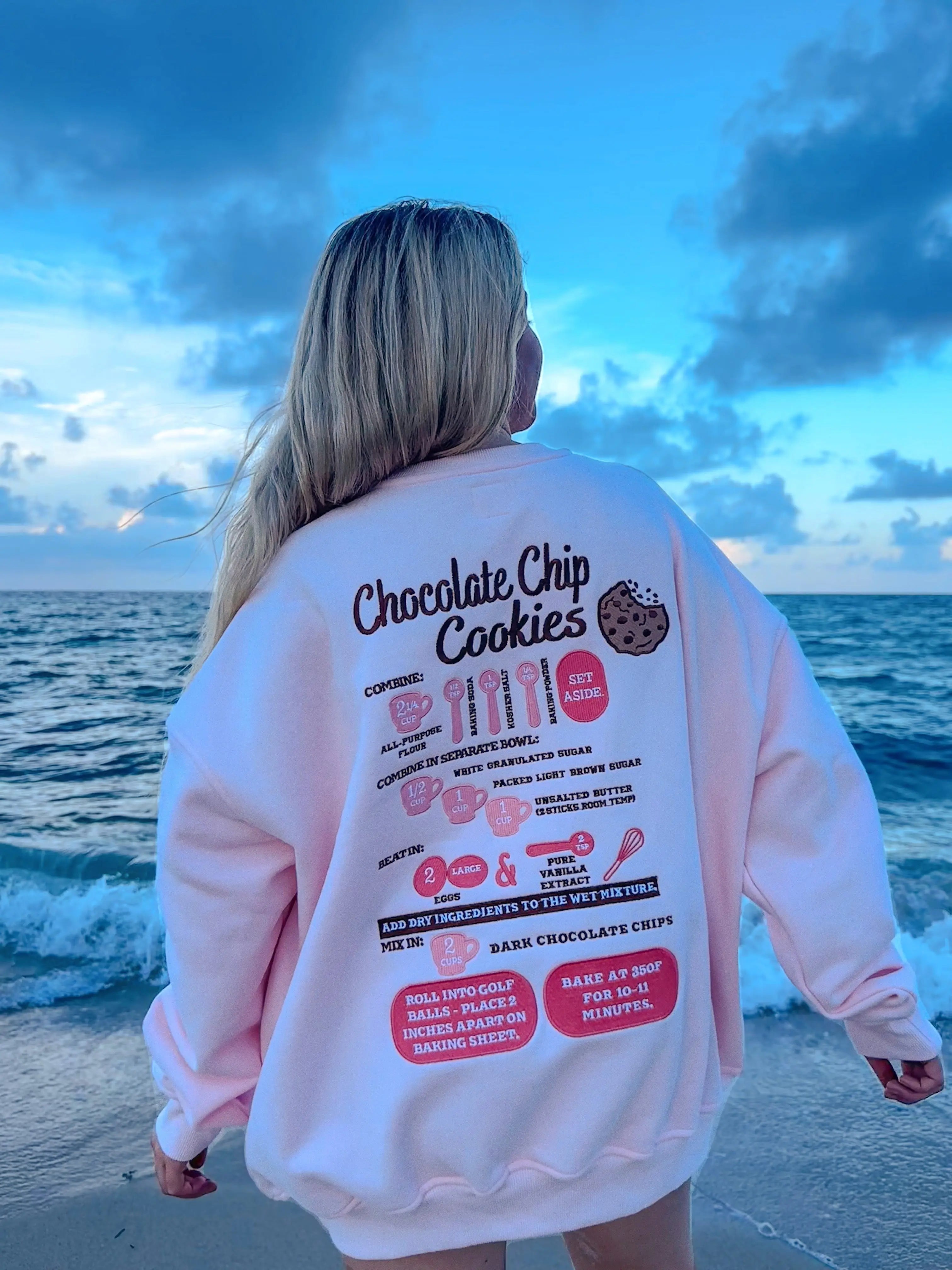 Product Details This is the Light Pink Chocolate Chip Cookie Recipe Embroidered Sweatshirt. A sweet and stylish piece featuring a charmingly detailed cookie recipe embroidered on the front, perfect for baking enthusiasts and cozy days.