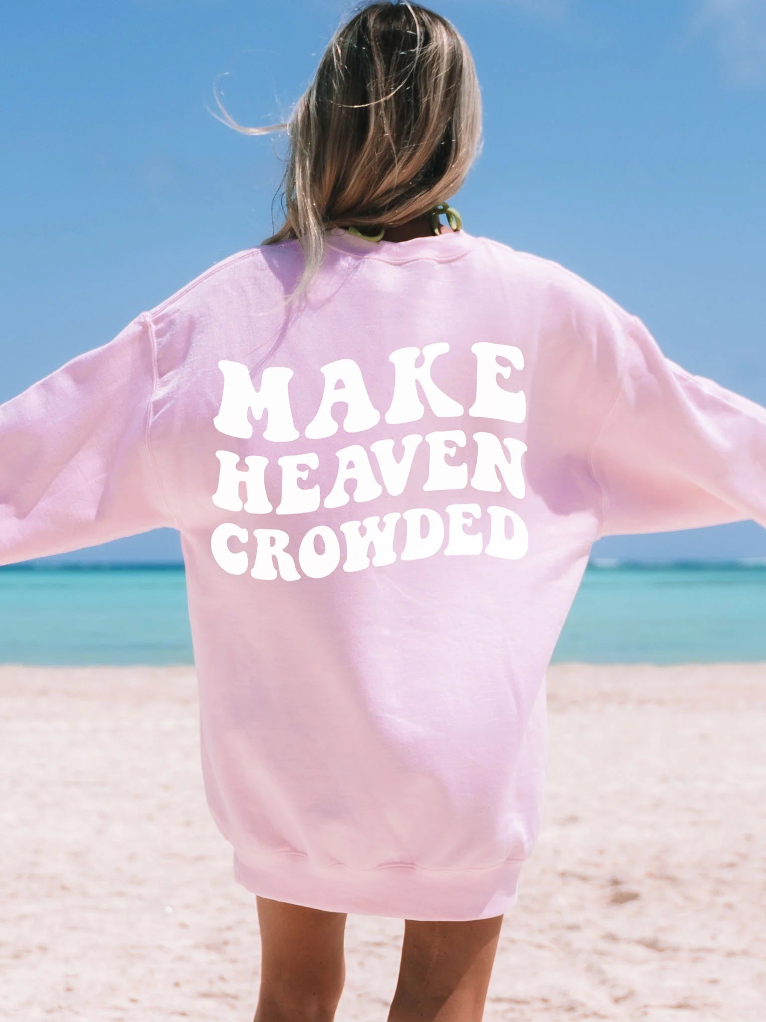 Share your faith in style with this adorable and super comfortable crewneck sweatshirt. Featuring the inspiring "Make Heaven Crowded" message, this preppy Christian top is perfect for everyday wear and makes a meaningful gift. Choose your usual size for a relaxed fit, or size up for a trendy, oversized look that's effortlessly cool. FREE SHIPPING on every order!