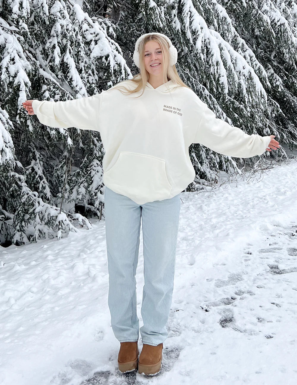 Wear your faith with comfort and style. This soft cream hoodie features the uplifting Genesis 1:27 verse, a beautiful reminder of your unique purpose and identity. Designed for everyday inspiration and cozy moments.