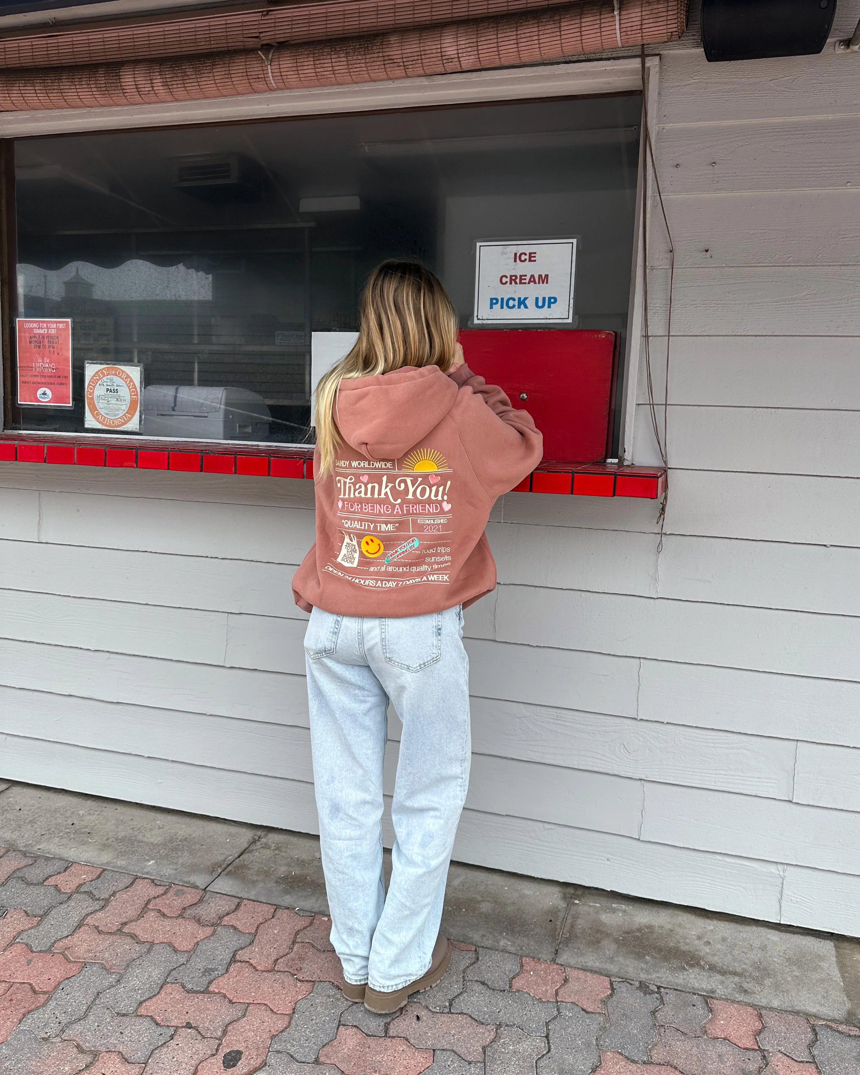 Please see the product description for details on the model's height and hoodie size for visual reference.