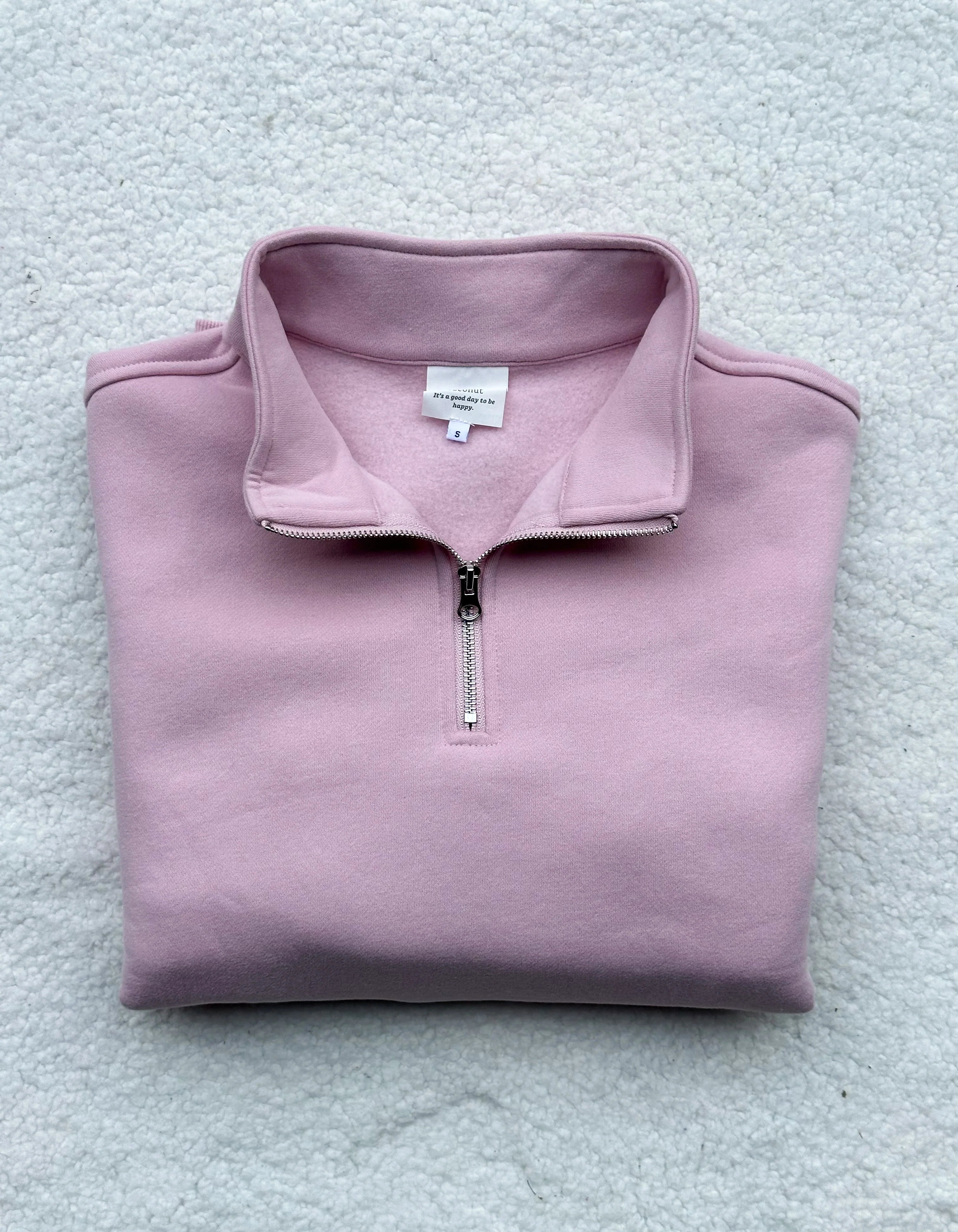 Nela is wearing a size Large in this quarter-zip sweatshirt for a comfortably oversized fit.