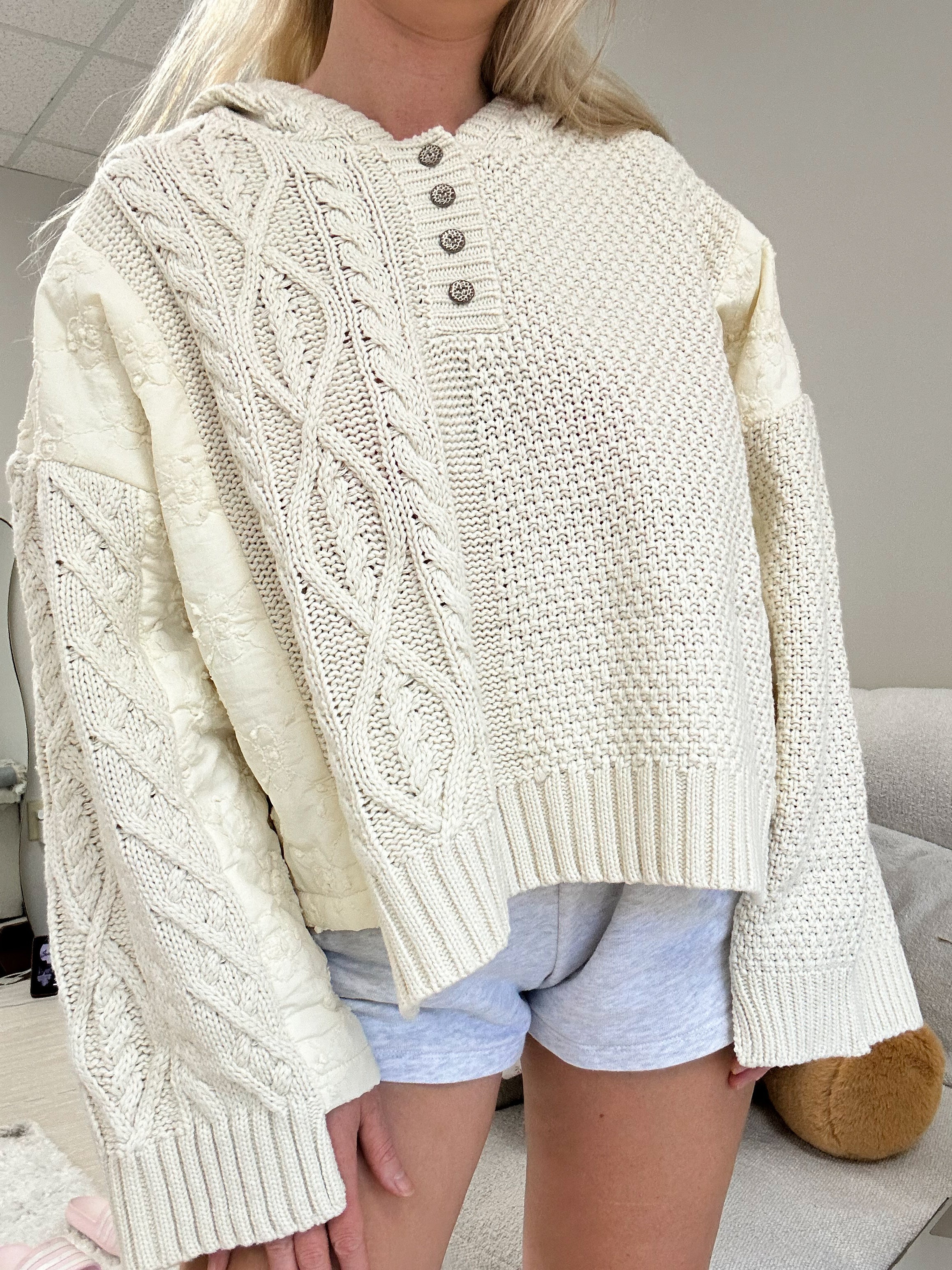 Embrace effortless style with this cozy quilted hoodie sweater. Designed for everyday comfort, its long sleeves and regular fit offer a versatile silhouette perfect for layering. The unique quilting patch, half-placket metal buttons, and ribbed band details add a touch of refined texture to your casual wardrobe. In a solid, easy-to-style color, this piece transitions seamlessly from relaxed mornings to casual outings.