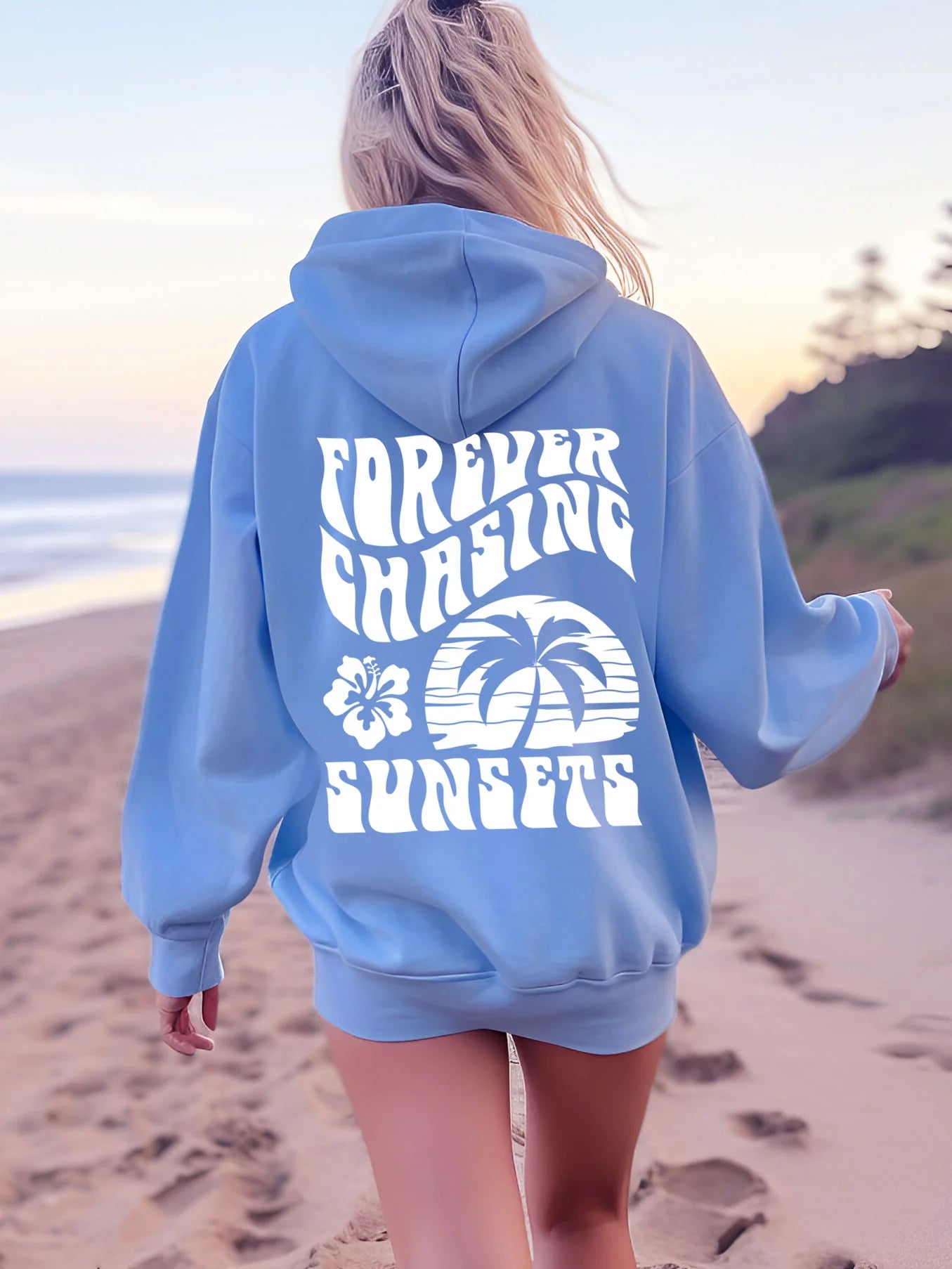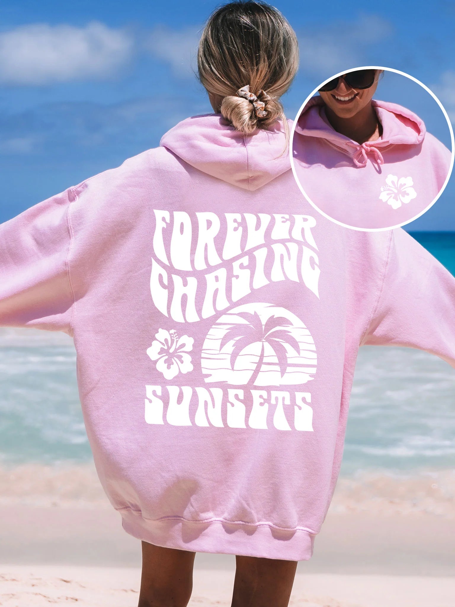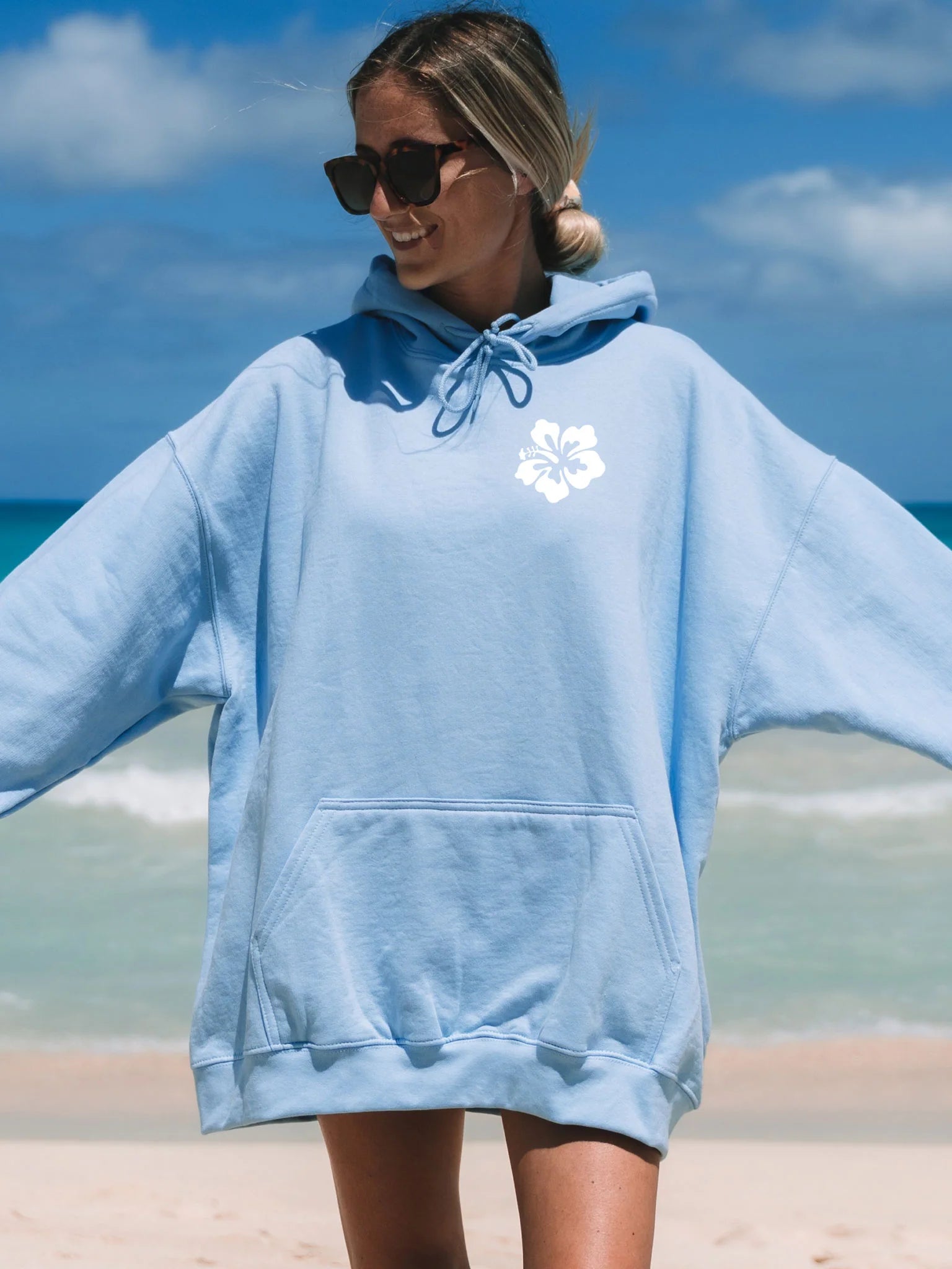 Embrace the coastal vibe with this super comfy double sided sunset hoodie. Featuring a beautiful hibiscus and beachy sunset design, it's the perfect piece for effortless, everyday style. Size up for a trendy oversized look that's perfect for layering. SHIPS FREE!