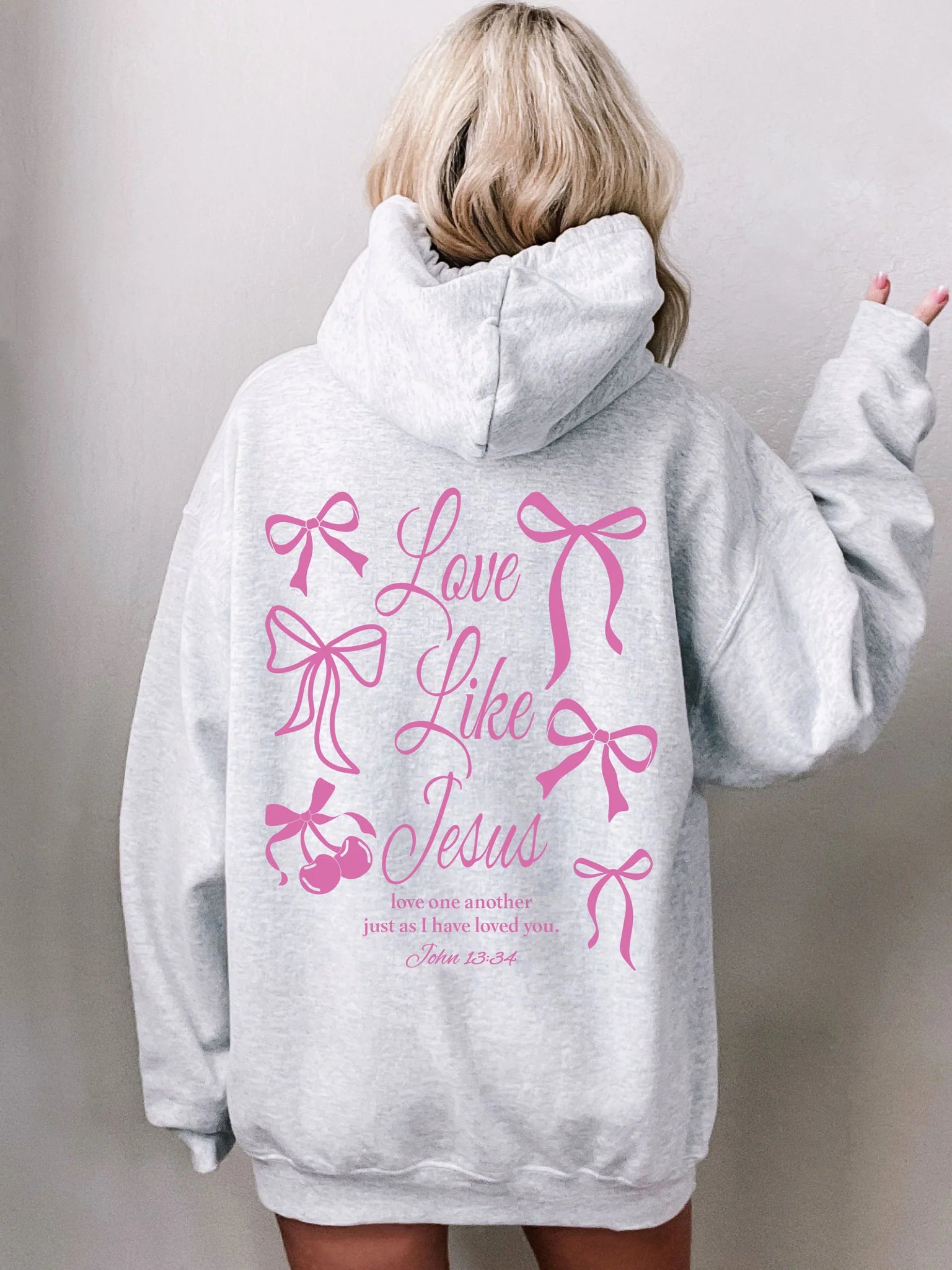 Embrace a sweet and meaningful style with this double-sided coquette hoodie. The front features a delicate pink bow design, while the back carries an inspiring "Love Like Jesus" message, perfect for expressing your faith with a feminine touch. Crafted for ultimate comfort in a soft, cozy fabric. For a trendy oversized look, we recommend sizing up. Enjoy free standard shipping on your order.