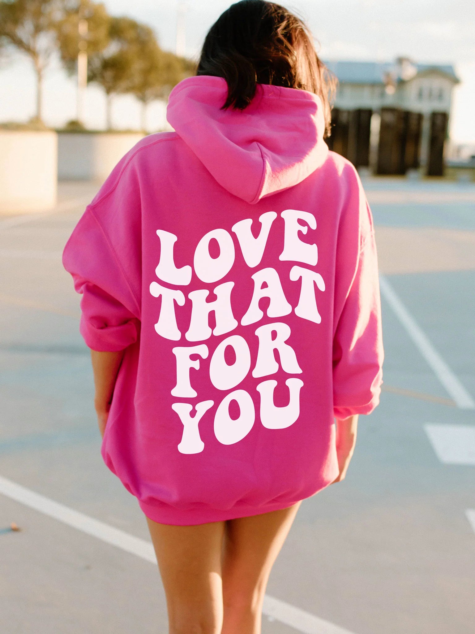 Share a positive message with this cute and cozy Love That For You Hoodie. This preppy aesthetic staple is designed for ultimate comfort and effortless style. Choose your usual size for a relaxed fit, or size up for a trendy oversized look that's perfect for lounging and street style. SHIPS FREE!