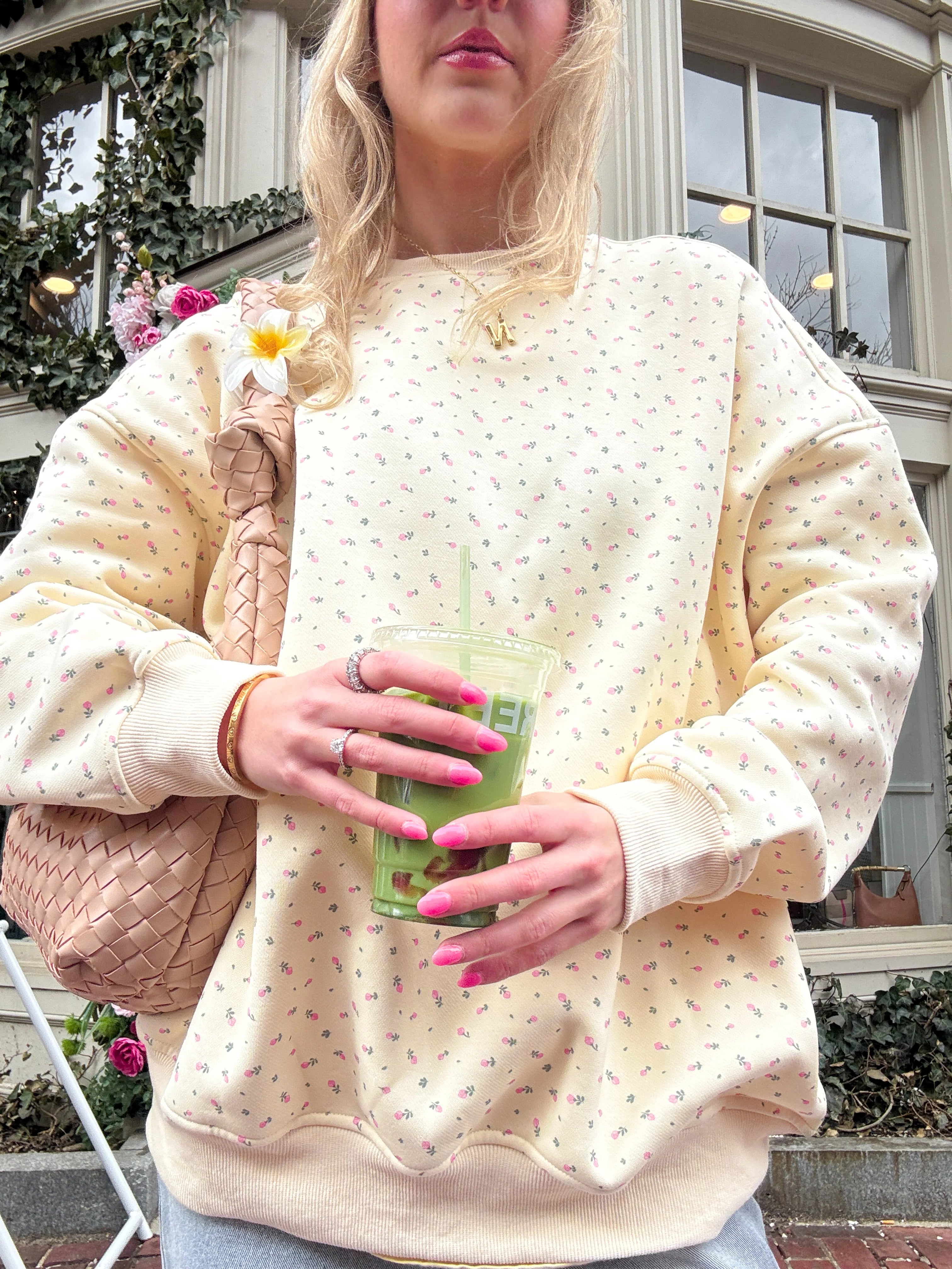Nela is wearing a size Large in this sweatshirt and medium bottoms.