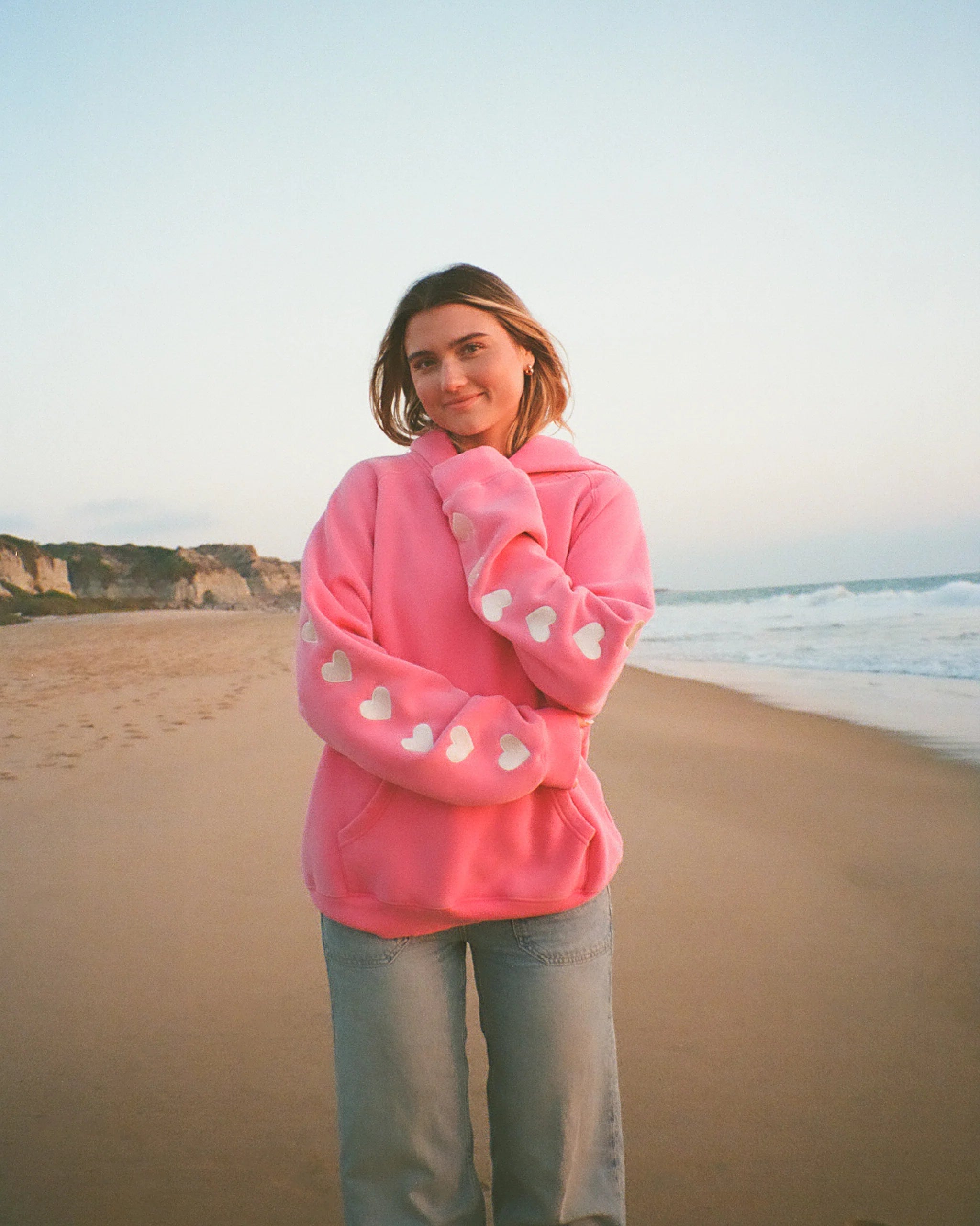 Make a statement with this bold and romantic oversized hoodie, featuring a unique heart detail on the sleeve.