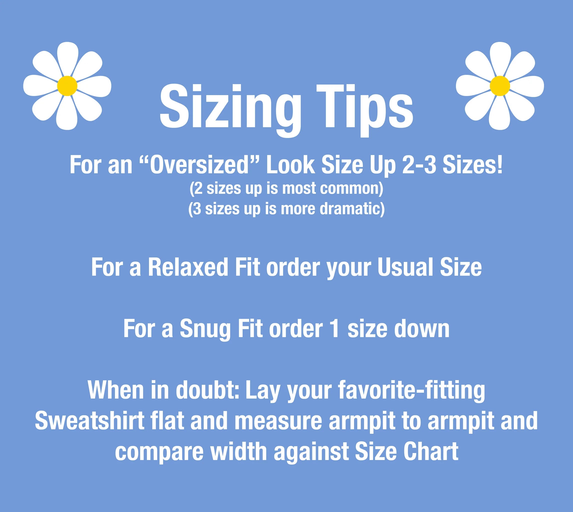 SIZING TIPS: For a dramatic oversized silhouette, size up 2-3 sizes from your usual fit. A 2-size increase offers a popular relaxed look, while 3 sizes up creates a more dramatic street-style effect. For a standard relaxed fit, order your usual size. When in doubt, measure your favorite sweatshirt from armpit to armpit and compare it to our size chart in the product photos.